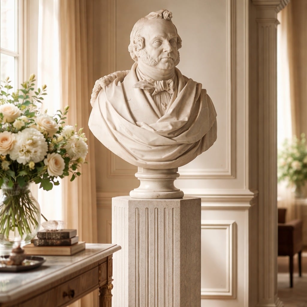 La scultura raffigura un uomo con un voluminoso ciuffo a boccolo sopra la fronte alta, mentre il volto abbondante, dalla caratteristica fossetta sul mento, è incorniciato da due folti favoriti. L’atteggiamento austero e lo sguardo severo rigidamente fisso su un punto imprecisato in lontananza rientrano nella tipologia del ritratto marmoreo celebrativo, richiamando il clima eroico dei primi dell’800. Il ricco abbigliamento, certamente finalizzato alla raffigurazione encomiastica dell’effigiato, rispecchia la moda dell’epoca: una camicia a collo montante, sulla quale all’altezza del petto è appuntata una spilla dalla singolare forma di Uroboro a “8”. Attorno al collo porta una cravatta annodata, mentre sulle spalle, ad avvolgere la figura, un lussuoso mantello bordato di pelliccia; interessante è il panneggio del manto che risolve in modo elegante il taglio a mezzobusto della scultura.