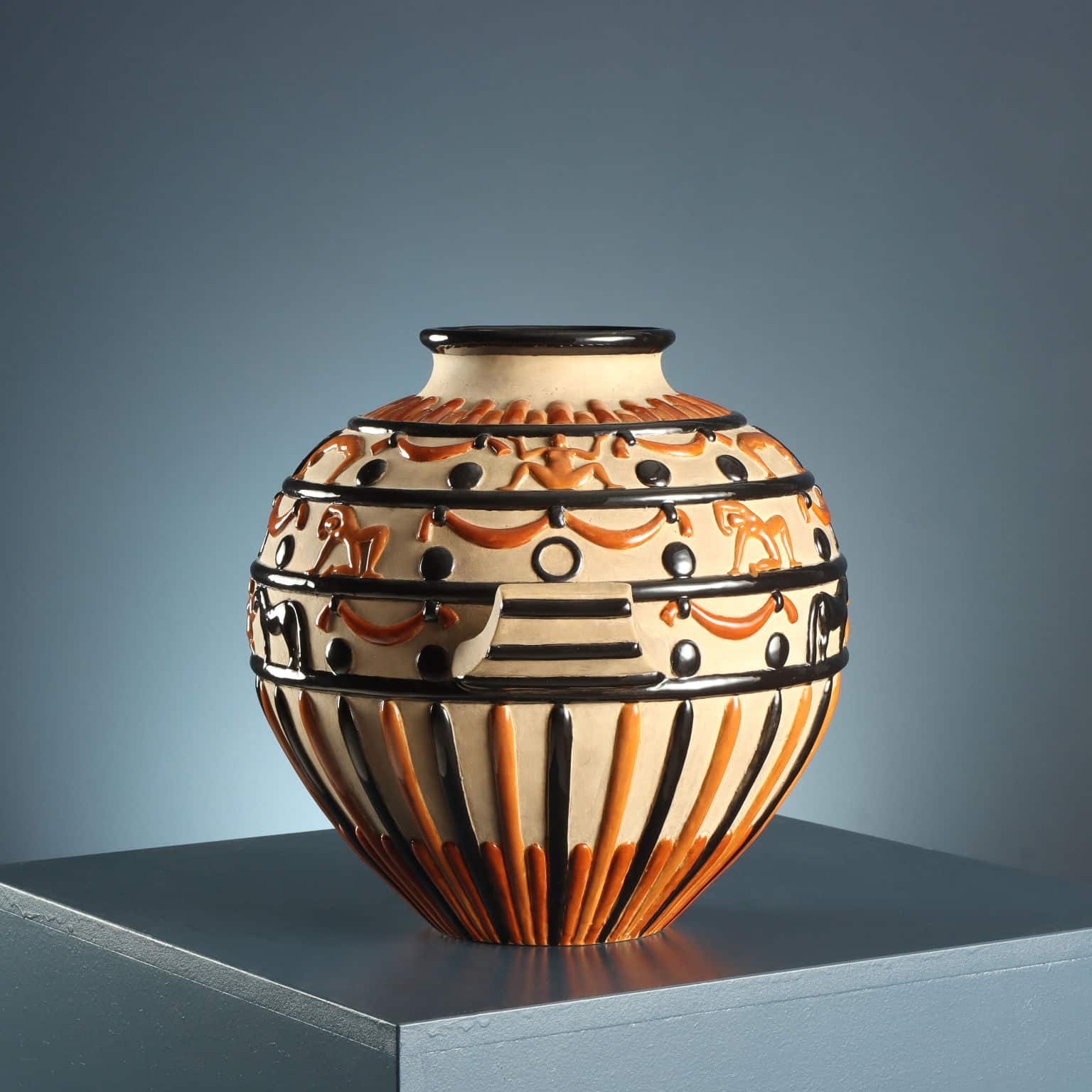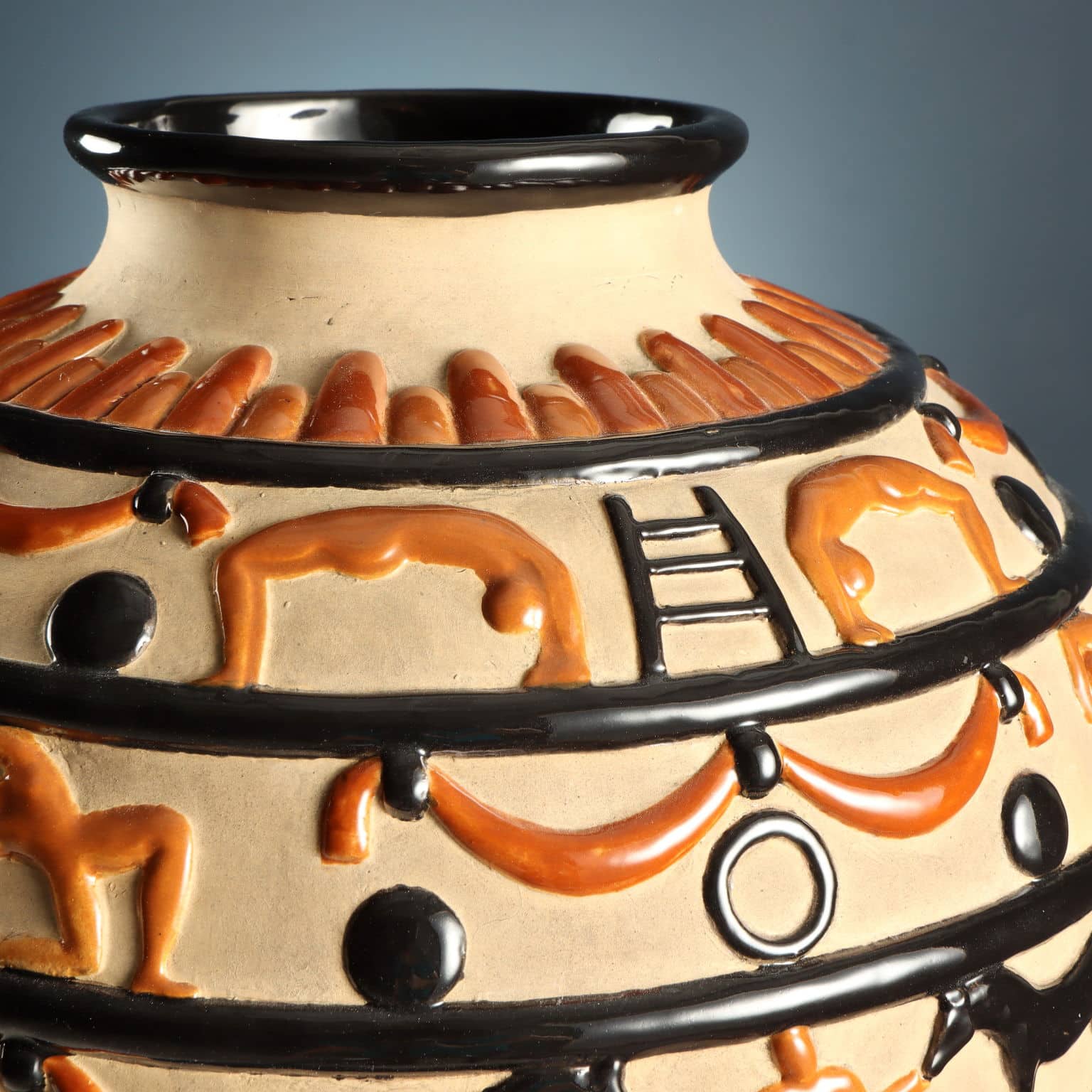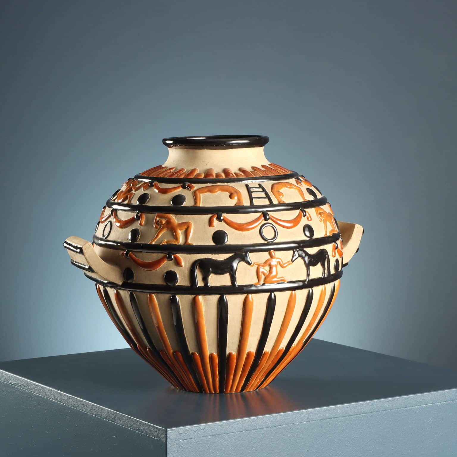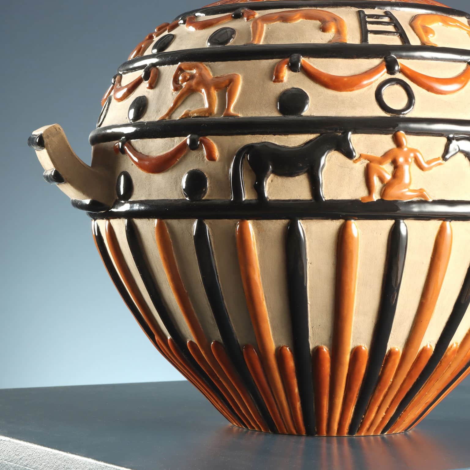 Vaso in ceramica con due prese laterali e decorazioni circensi a rilievo. Finitura su fondo