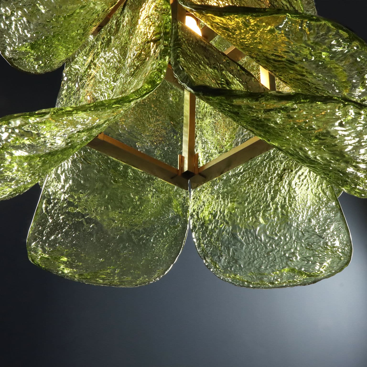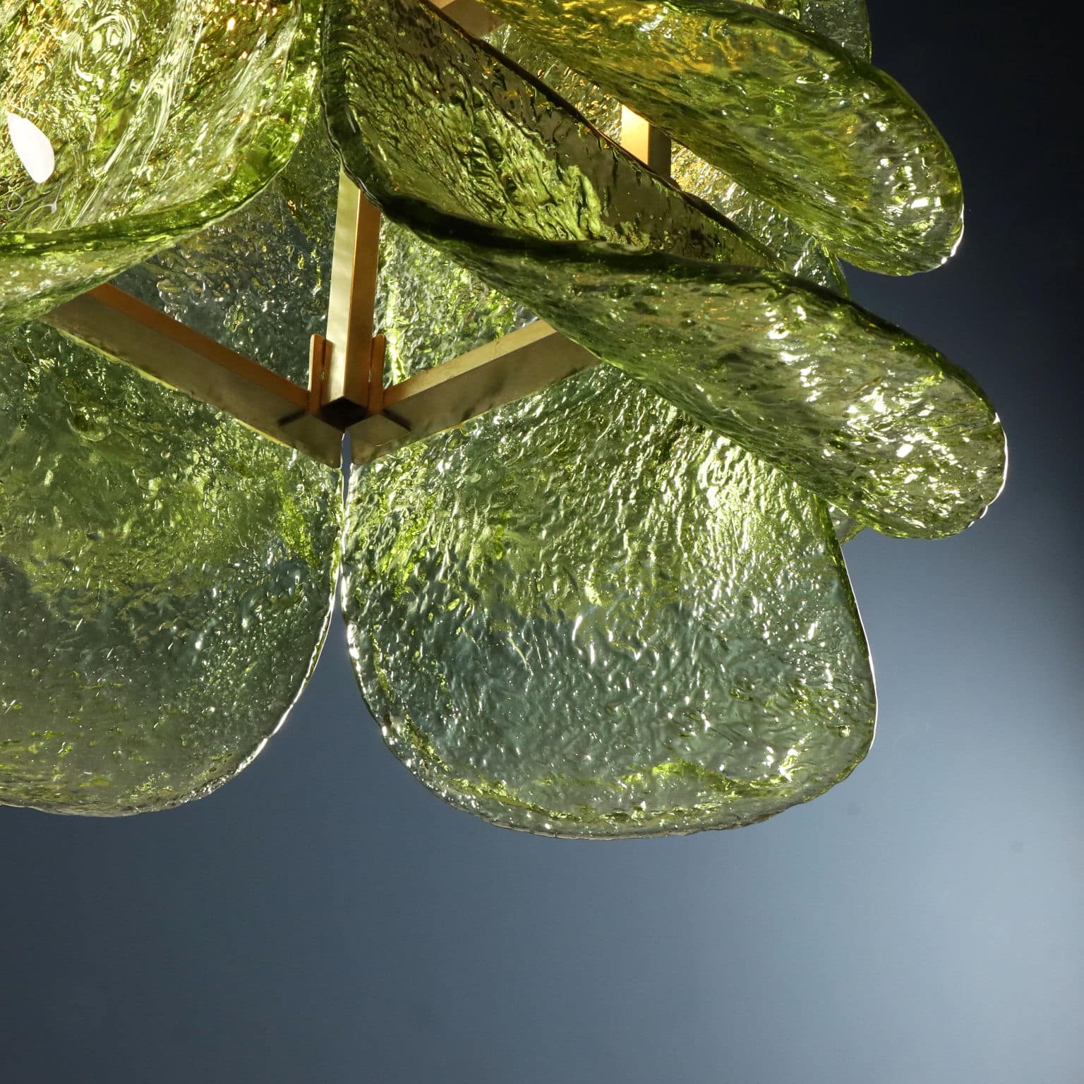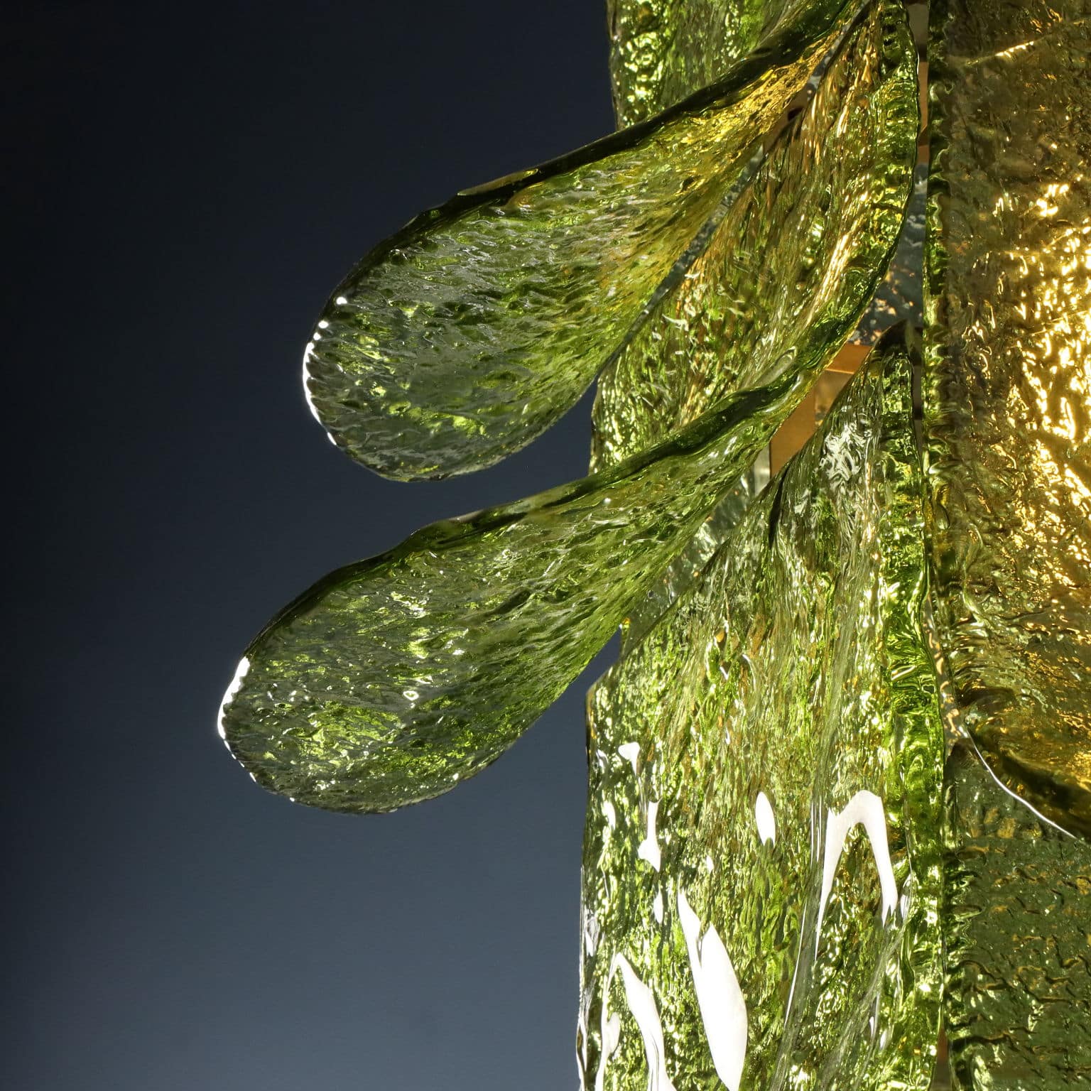 La lampada presenta una struttura in metallo satinato, due punti luce e foglie in vetro di Murano curvato nei toni del verde di differenti dimensioni a posizione regolabile.