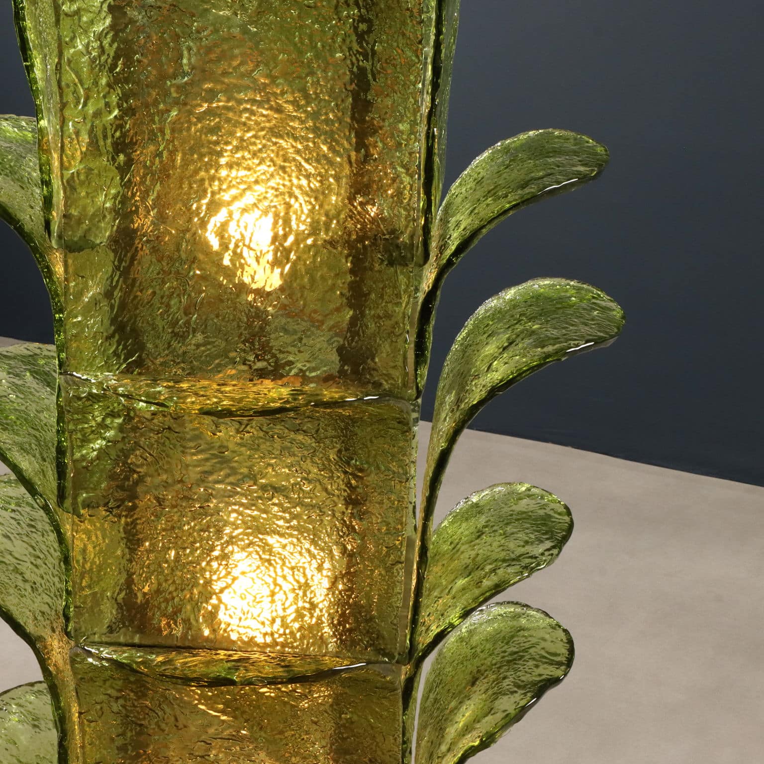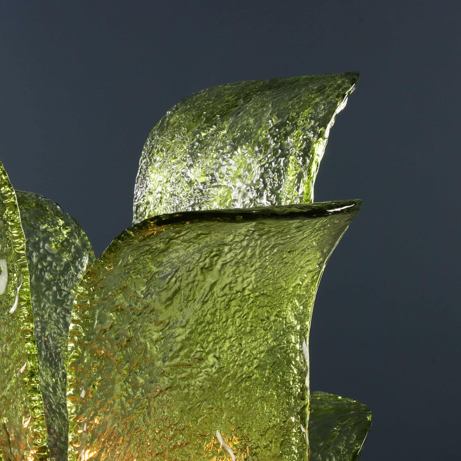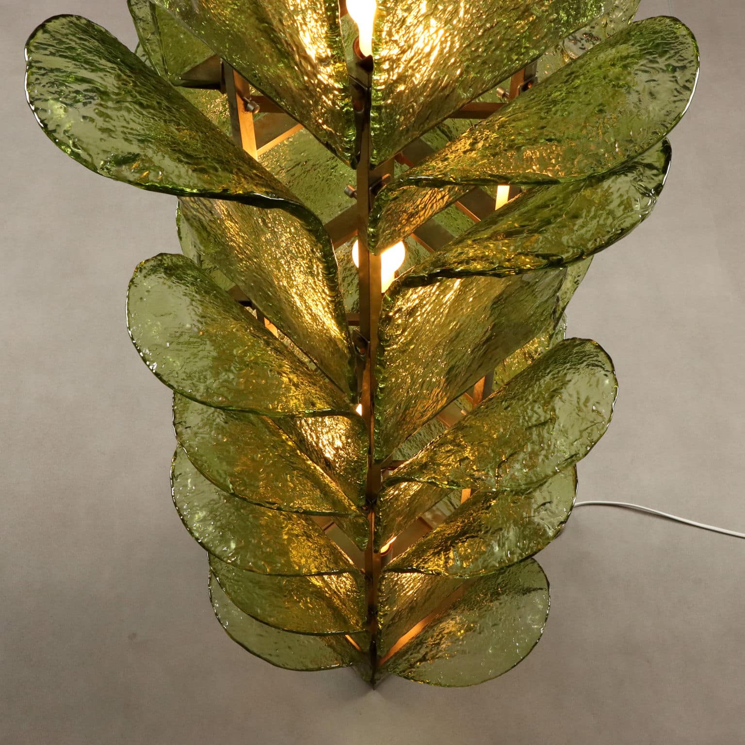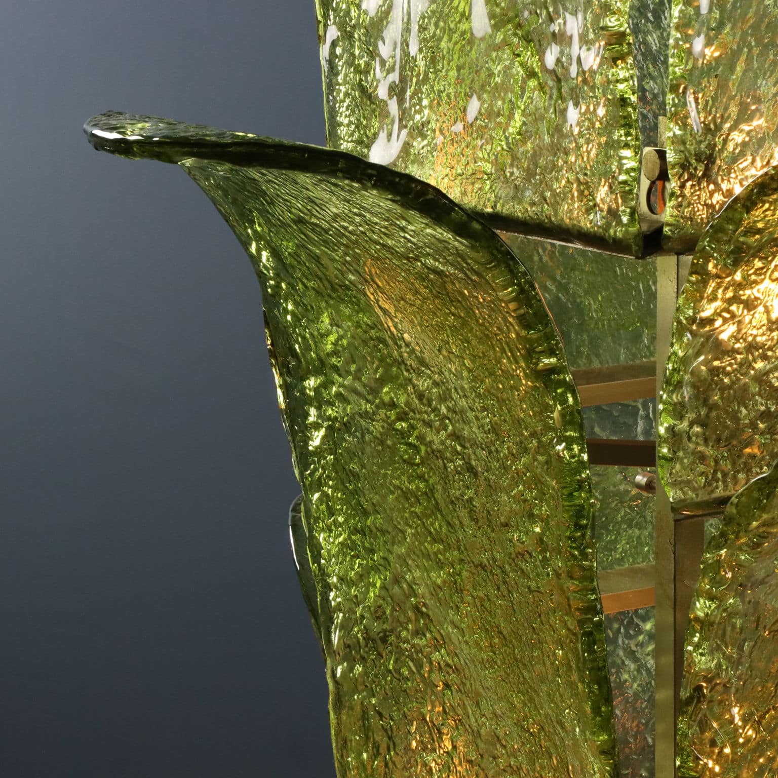 La lampada presenta una struttura in metallo satinato, quattro punti luce e foglie in vetro di Murano curvato nei toni del verde di differenti dimensioni a posizione regolabile.