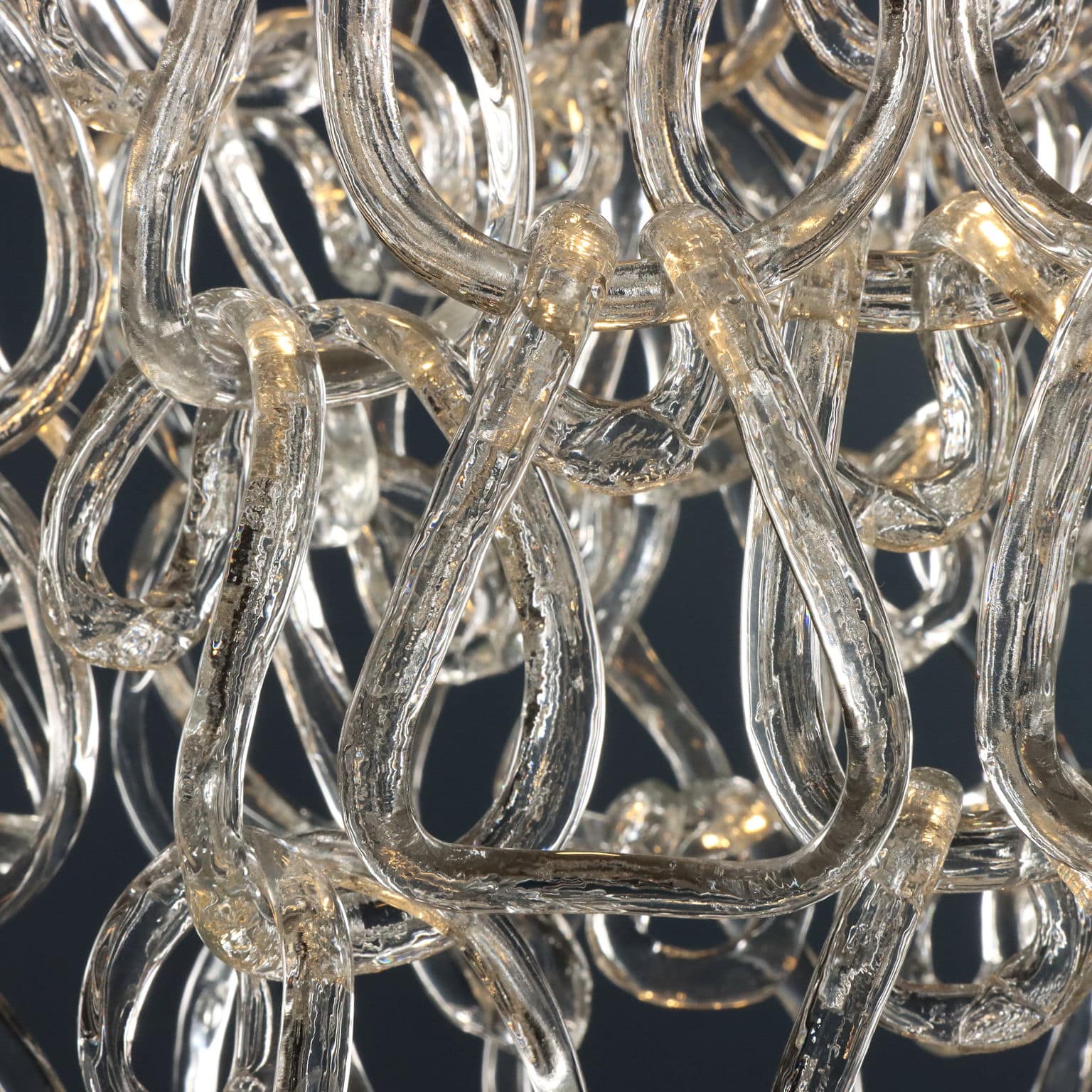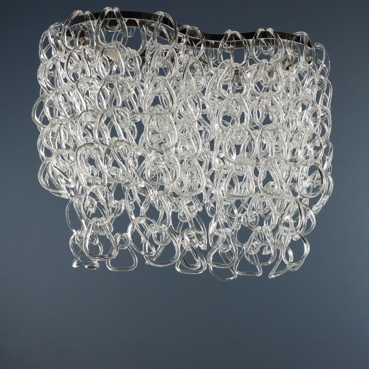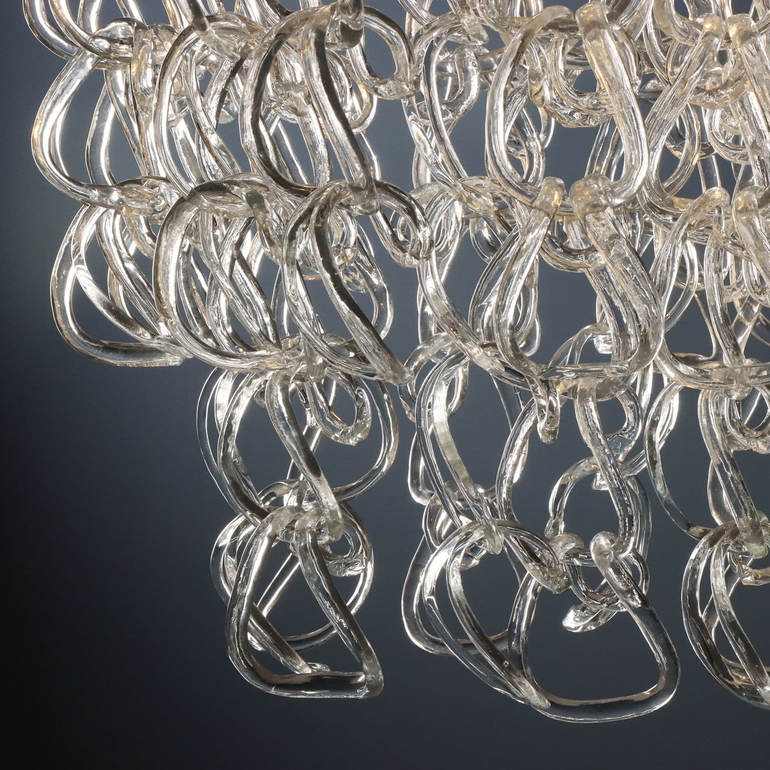 Lampade a soffitto della serie ‘Giogali’ con pendenti in vetro di Murano trasparenti, intrecciati su una cornice in metallo cromato.