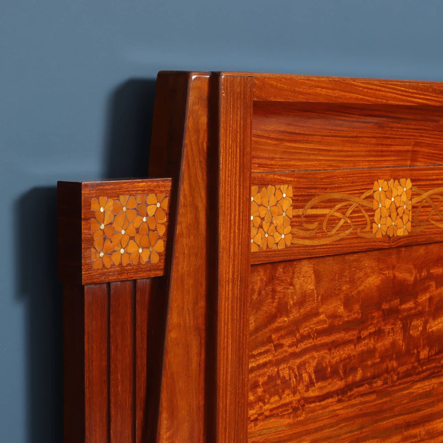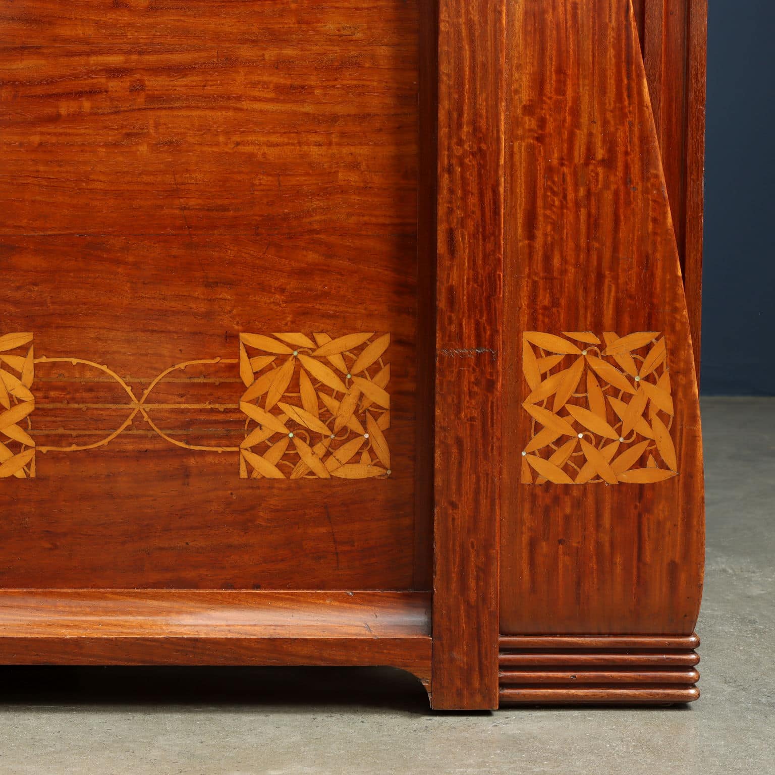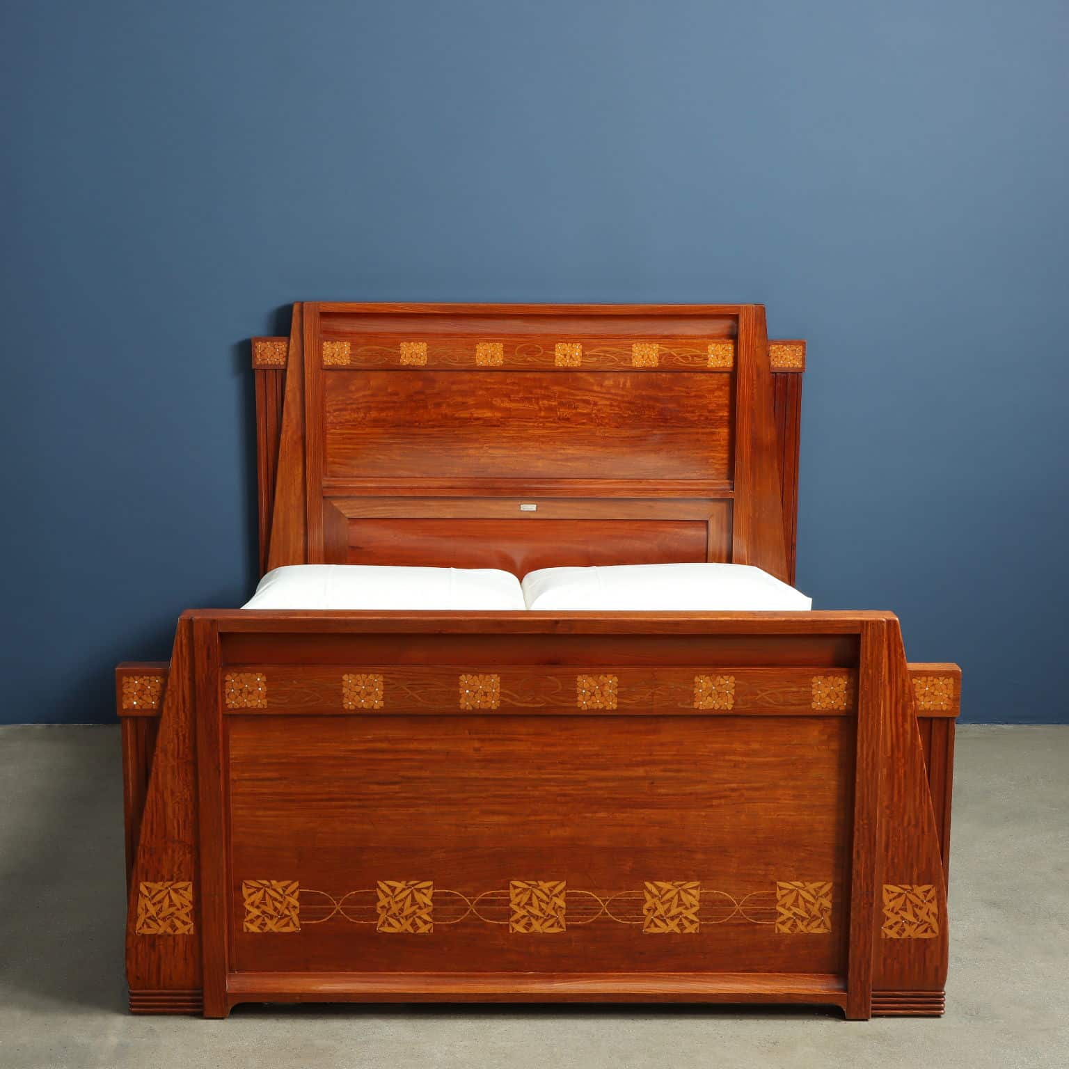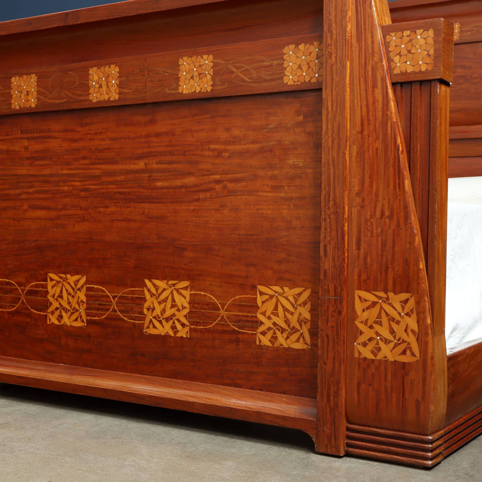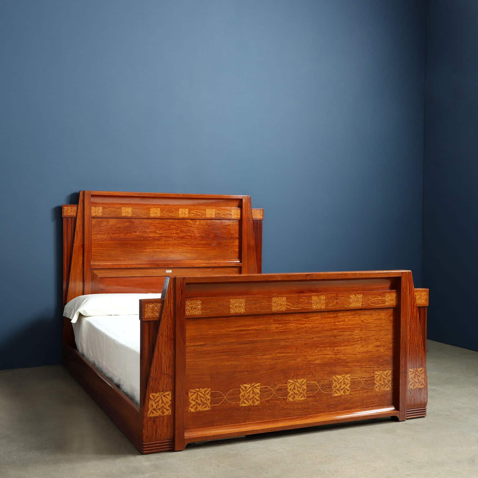 Gli intarsi floreali sono di due tipi, entrambi realizzati in legno d’acero con inserto in madreperla, contenuti in una sezione quadrata, in un caso raccordati tra loro da nastri in mogano nell’altro da rami spinosi in acero. Gli Interni sono realizzati in rovere. Al centro della testata del letto vi è apposta una placca in metallo inciso “CARLO ZEN MILANO”.