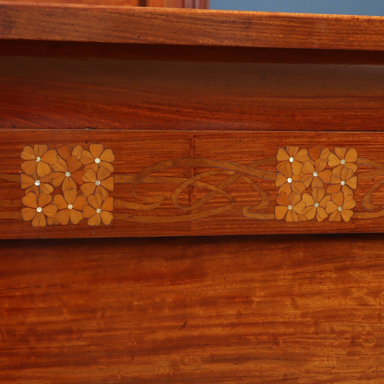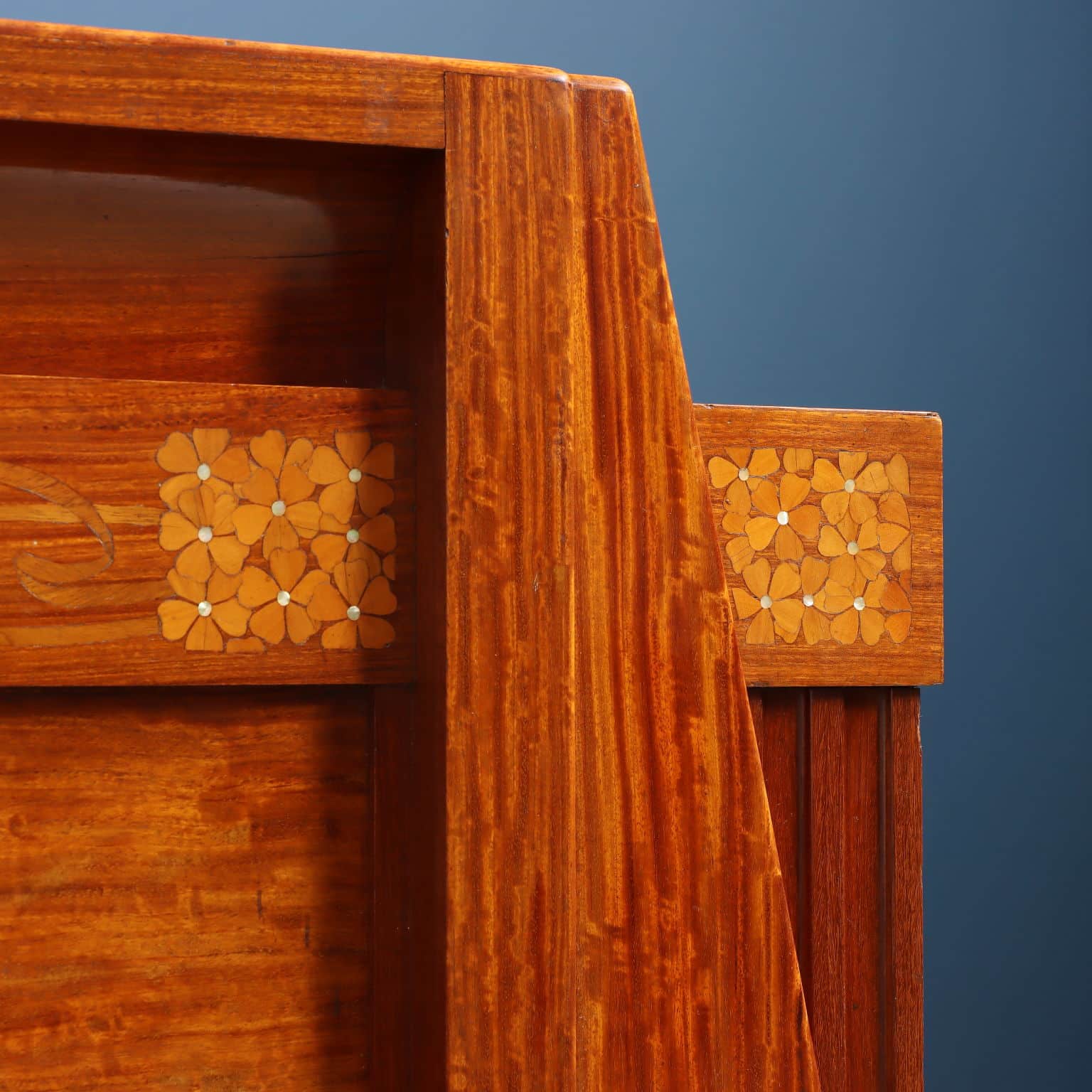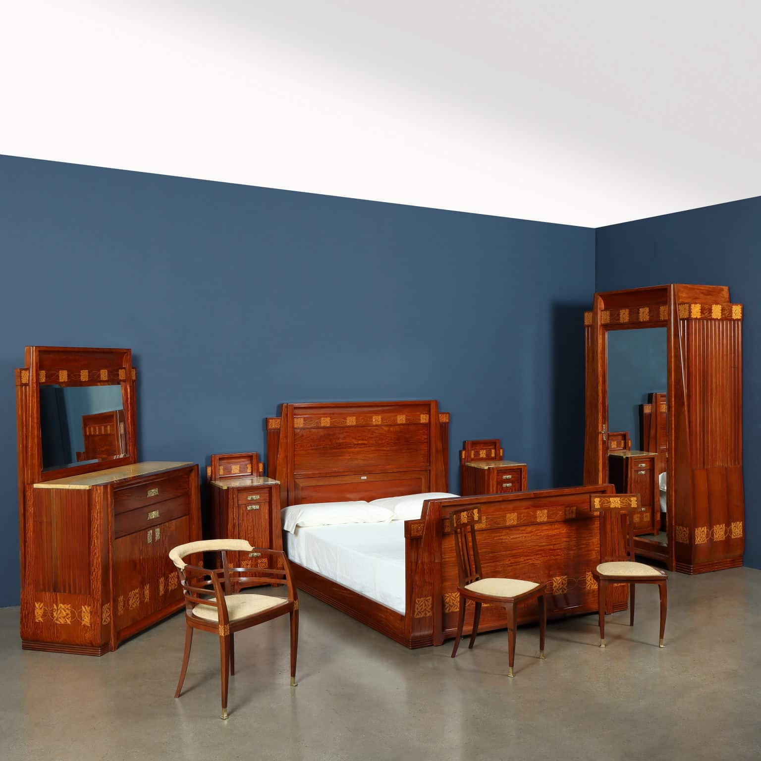 Un disegno architettonico sapiente e per l’epoca estremamente moderno caratterizza la produzione di questi arredi. Sono una poltroncina a pozzetto da camera e due sedie prodotte dall’azienda Carlo Zen. Linee estremamente eleganti caratterizzano gli schienali a giorno e le gambe arcuate, rivestite da eleganti scarpette in bronzo. Nel mogano sono inseriti intarsi floreali realizzati in legno d’acero con inserto in madreperla, contenuti in una sezione quadrata raccordati tra loro da nastri in mogano.