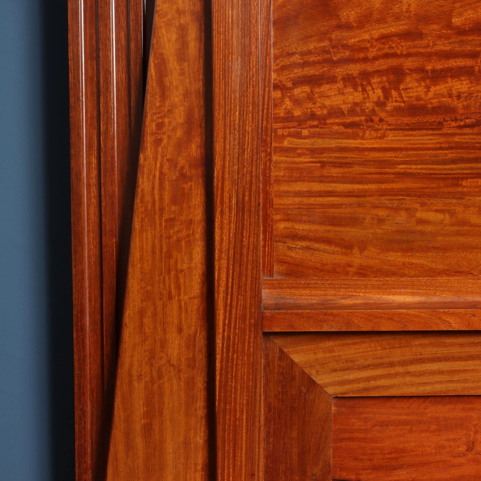 Un disegno architettonico sapiente e per l’epoca estremamente moderno caratterizza la produzione di questi arredi in cui si sovrappongono piani inclinati dritti o curvi, con superfici che possono essere lisce, scanalate o intarsiate. All’architettura dell’arredo si aggiungono i preziosi materiali come il mogano marezzato in cui risaltano intarsi.