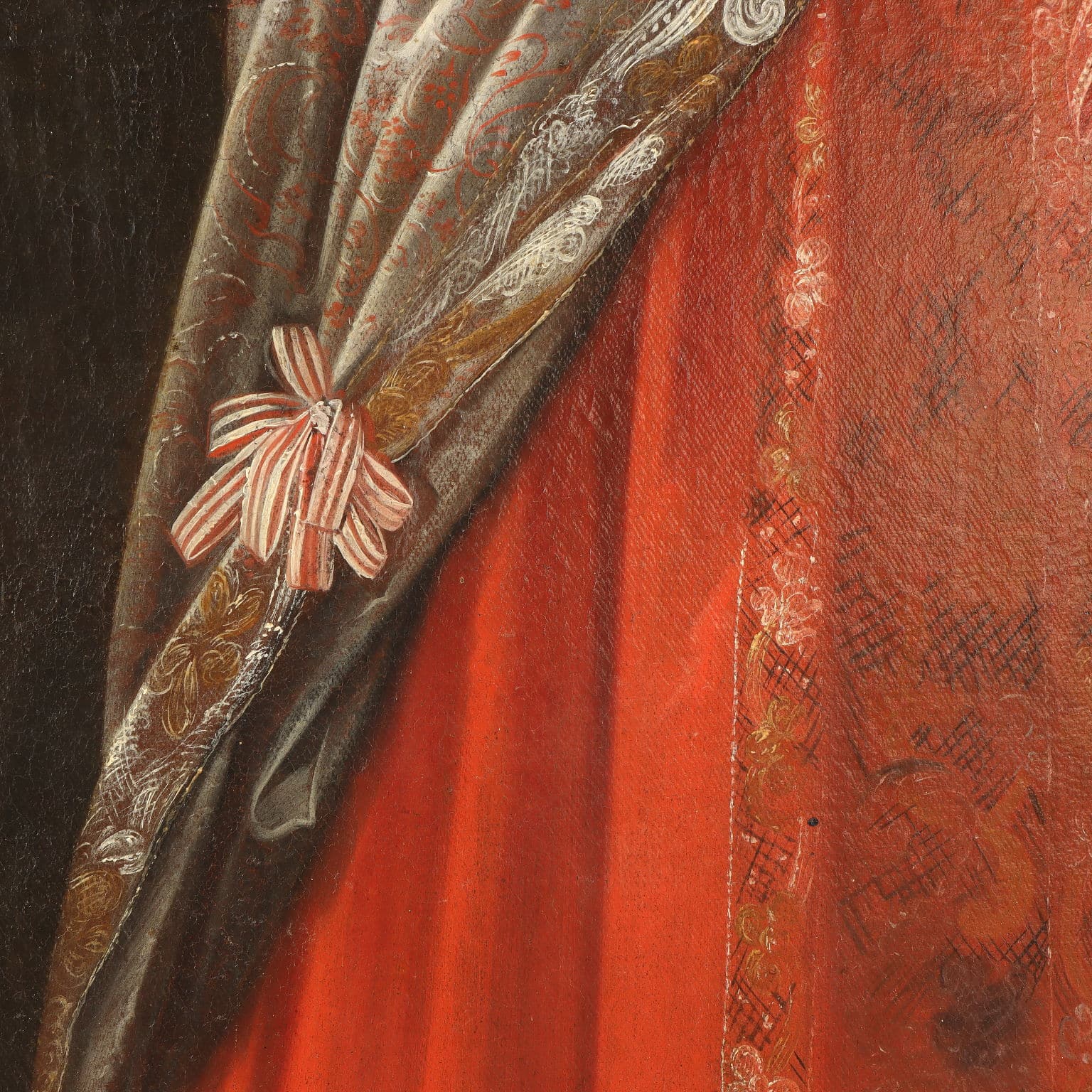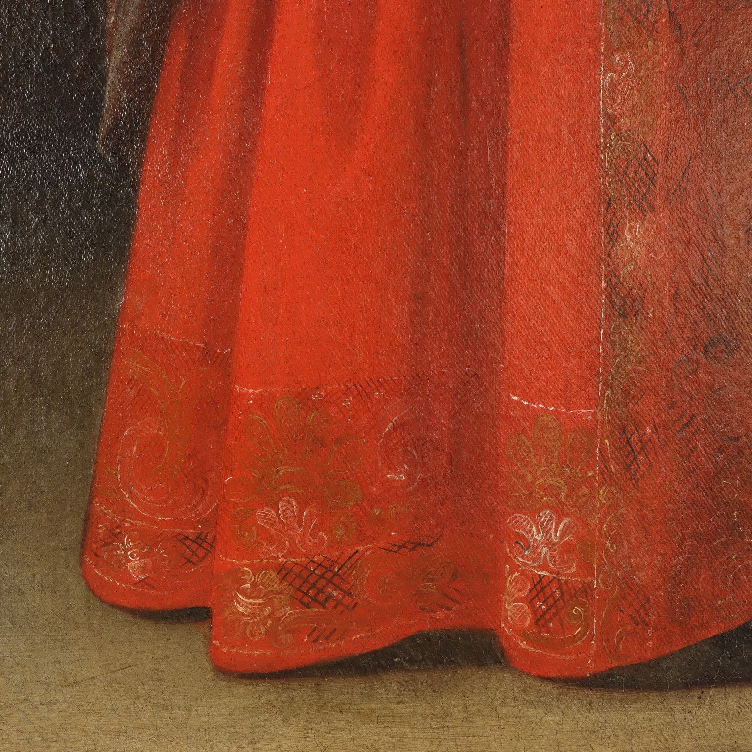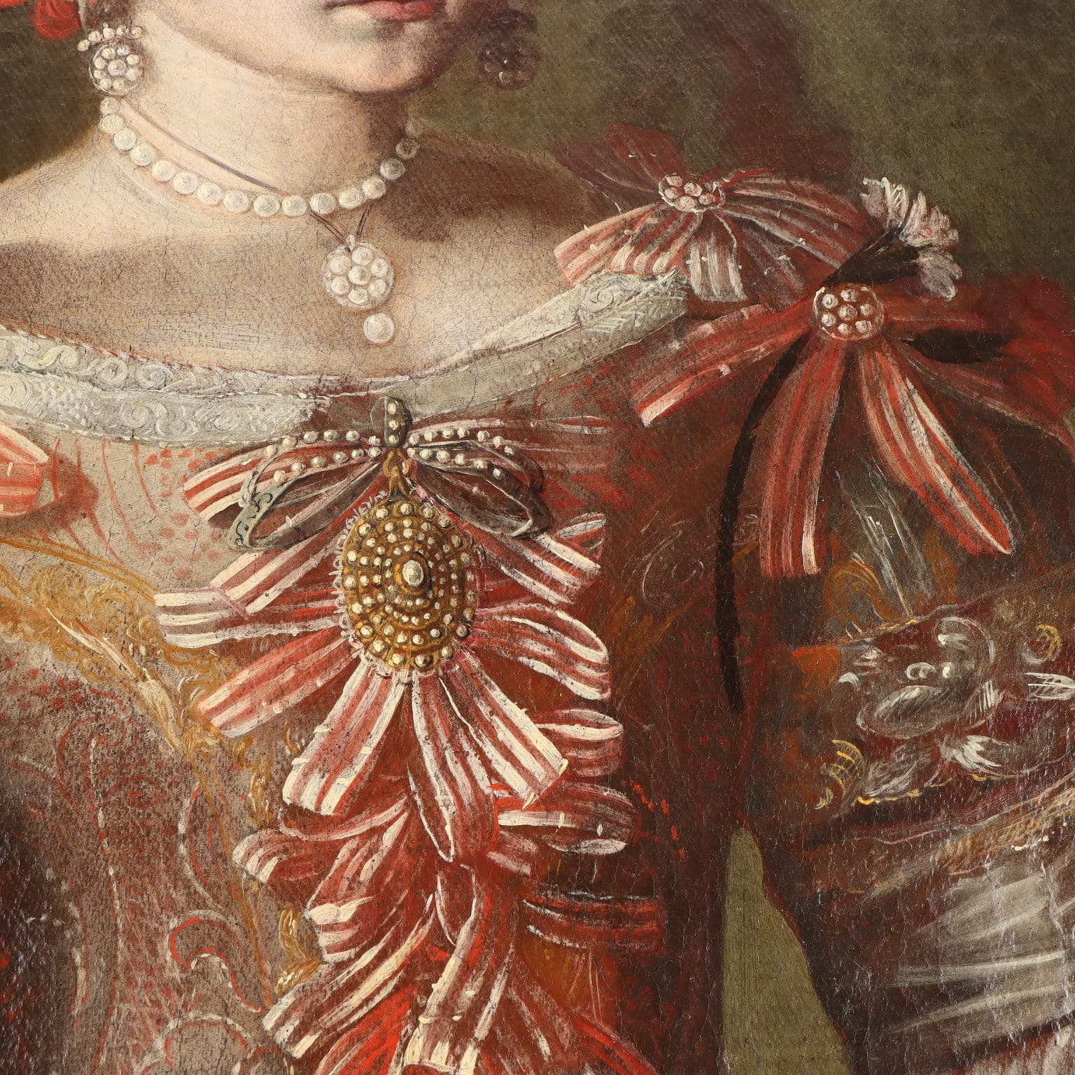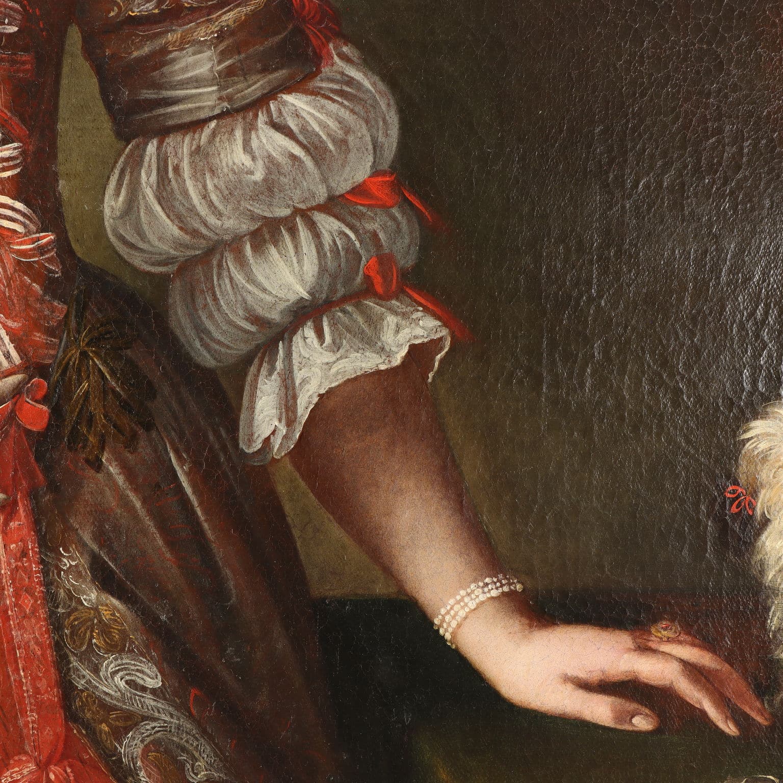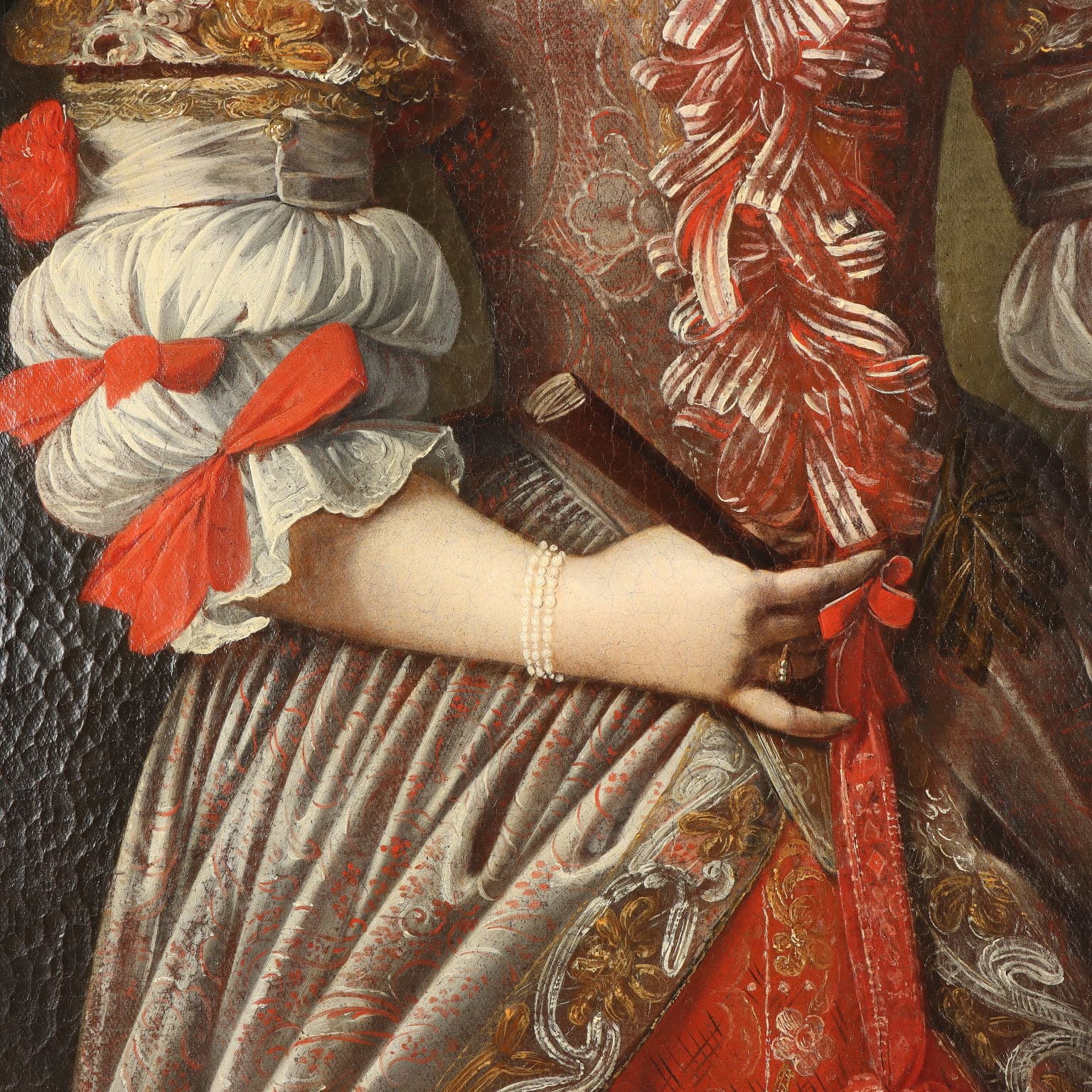 La gentildonna indossa un sontuoso abito composto da un corpetto in broccato dorato e argenteo, scollato e orlato di pizzo veneziano (“Gros point de Venise”), e una gonna di seta rossa operata con motivi a losanghe e fiori stilizzati (probabilmente damasco veneziano degli anni 1670-1680). I nastri e fiocchi bicromi rosso-bianco-argento, disseminati sull’abito e tra le chiome ricce, creano un raffinato effetto ornamentale.