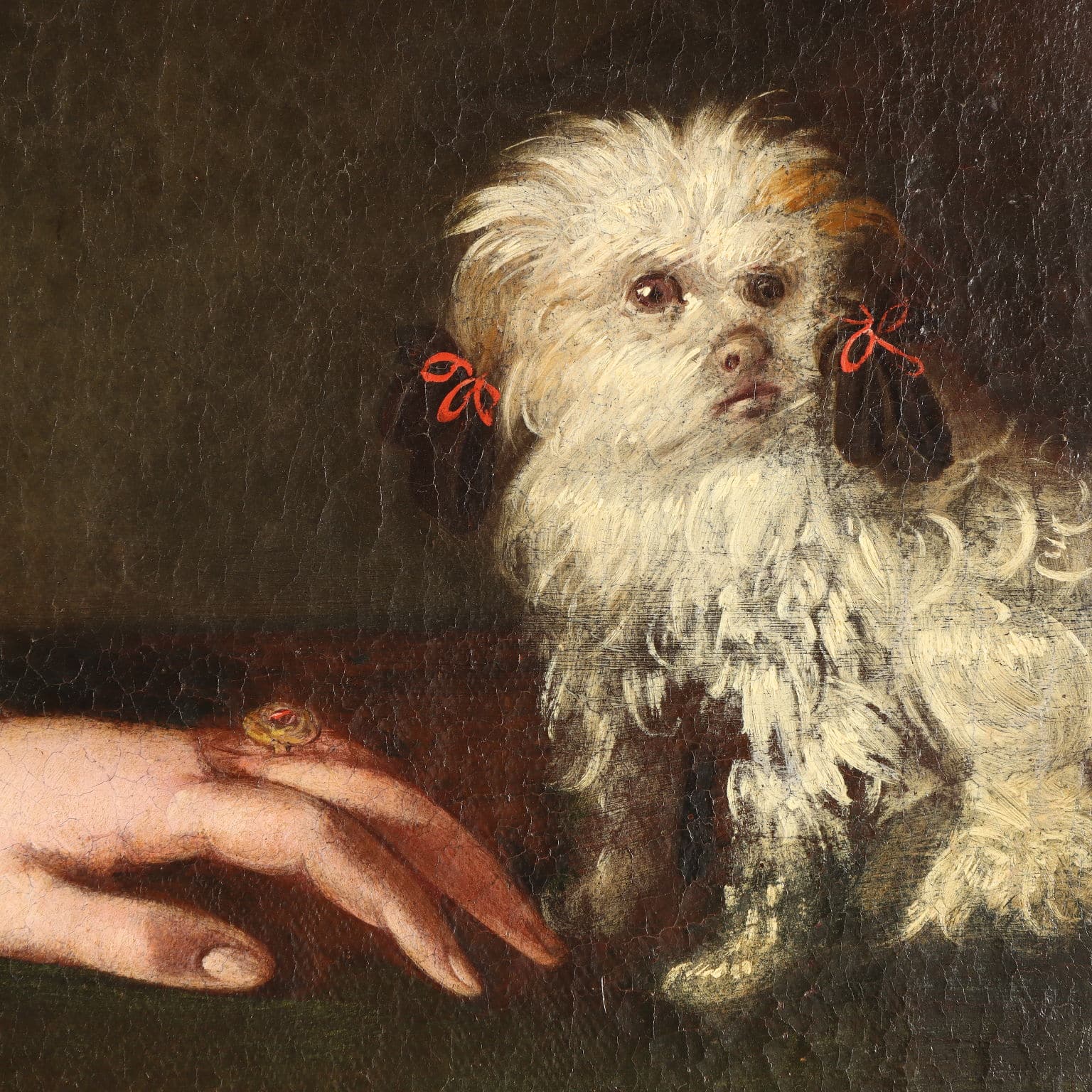 Accanto alla dama, un cagnolino bianco ornato da fiocchi rossi, simbolo di fedeltà coniugale, siede sul tavolo accanto a un medaglione d’argento bivalve e a un anello con rubino.