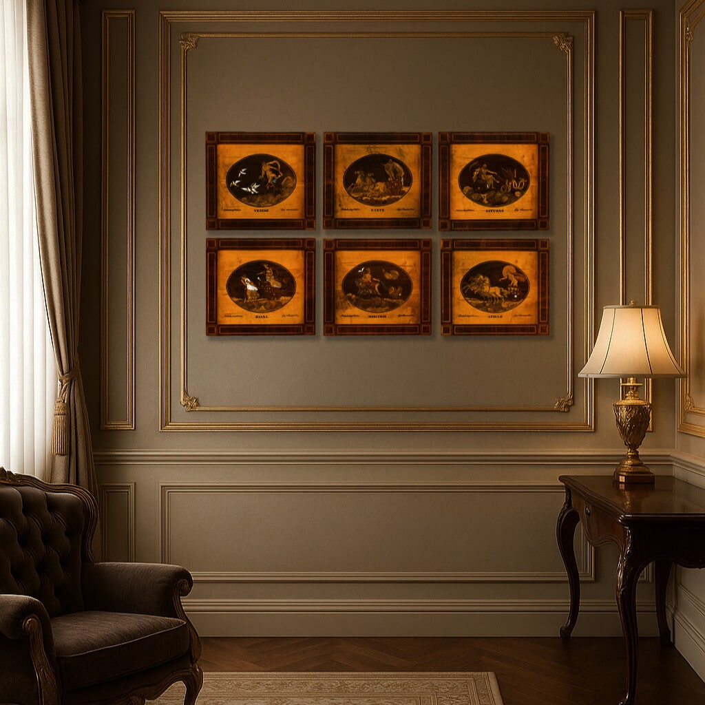 Questa serie è composta da sei pannelli realizzati con raffinato intarsio ligneo, raffiguranti altrettante divinità della mitologia greco-romana entro eleganti cornici ovoidali. Le cornici, fatto salvo per i riquadri degli spigoli, sono impiallacciate in bois de violette di testa anche nei profili e filettati con tre filetti in bosso, acero e cedro, le riserve ovali stesse, poste su un fondo d’acero sono incorniciate dalla filettatura precedente con l’aggiunta di un filetto d’osso. Le divinità sono invece eseguite mediante intarsio di legno su di un fondo di bois de violette con l’utilizzo di vari legni, ed osso in alcuni particolari tinto. Particolarmente di pregio e raffinata nell’esecuzione è la bulinatura che ombreggia e disegna il legno intarsiato, conferendo plasticità alle figure.