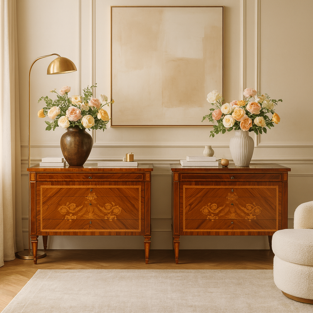 Coppia di comò a quattro cassetti e un comodino con anta e cassetto sotto piano. I mobili realizzati in noce massello sono impiallacciati principalmente in noce rigatino con intarsi in legni vari, non tutti identificati, tra cui acero, bosso, acero tinto, ciliegio, noce d’india e altri legni esotici. Sul fronte la dimensione dei cassetti segue la disposizione del decoro, pertanto un piccolo cassetto sotto fascia marca la partitura scandita dalle mensole intarsiate a foglia d’acanto poste sugli spigoli dei montanti a rilievo. Gli altri tre cassetti dei comò, vedono quello centrale più grande per poter accogliere la parte principale del motivo ornamentale che decora la grande riserva in noce rigatino del fronte; si tratta di un vaso contenuto da due delfini affrontati che tengono con le fauci il festone floreale cascante dalla girale fogliacea che prende vita dalla loro coda, il vaso è arricchito da una composizione floreale e poggia su un frammento roccioso.