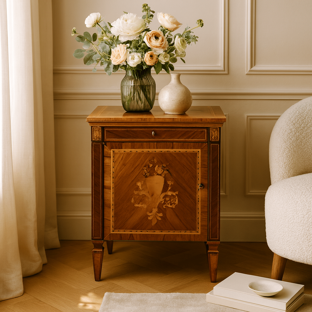 Sui fianchi una riserva come quella del fronte contiene un vaso fiorito contenuto tra due girali fogliacee. Il comodino allo stesso modo presenta sull’anta un vaso fiorito trattenuto da volute fogliacee, nei fianchi una soluzione simile con un vaso a fiaccola con fiamma accesa mossa dal vento.