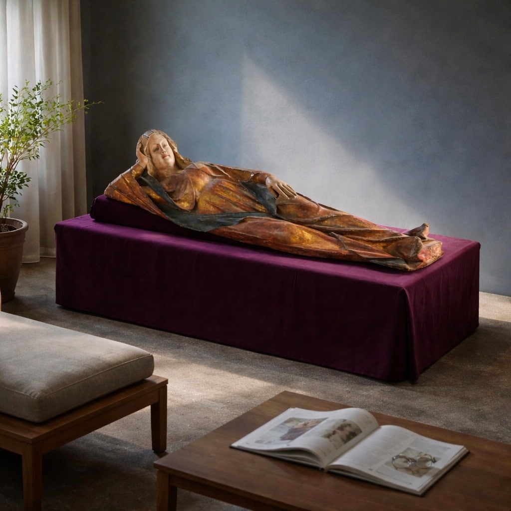 Scultura lignea policroma, raffigurante la Madonna giacente, anche detta Vergine della Natività. Maria è reclinata, la mano destra a sostenere il capo, mentre la sinistra è distesa e poggia sul fianco. È abbigliata con una lunga tunica e un mantello rosso all’esterno e blu all’interno, che le fascia completamente le gambe. Il capo è velato; sul volto dai lineamenti fini e delicati un’espressione assorta.